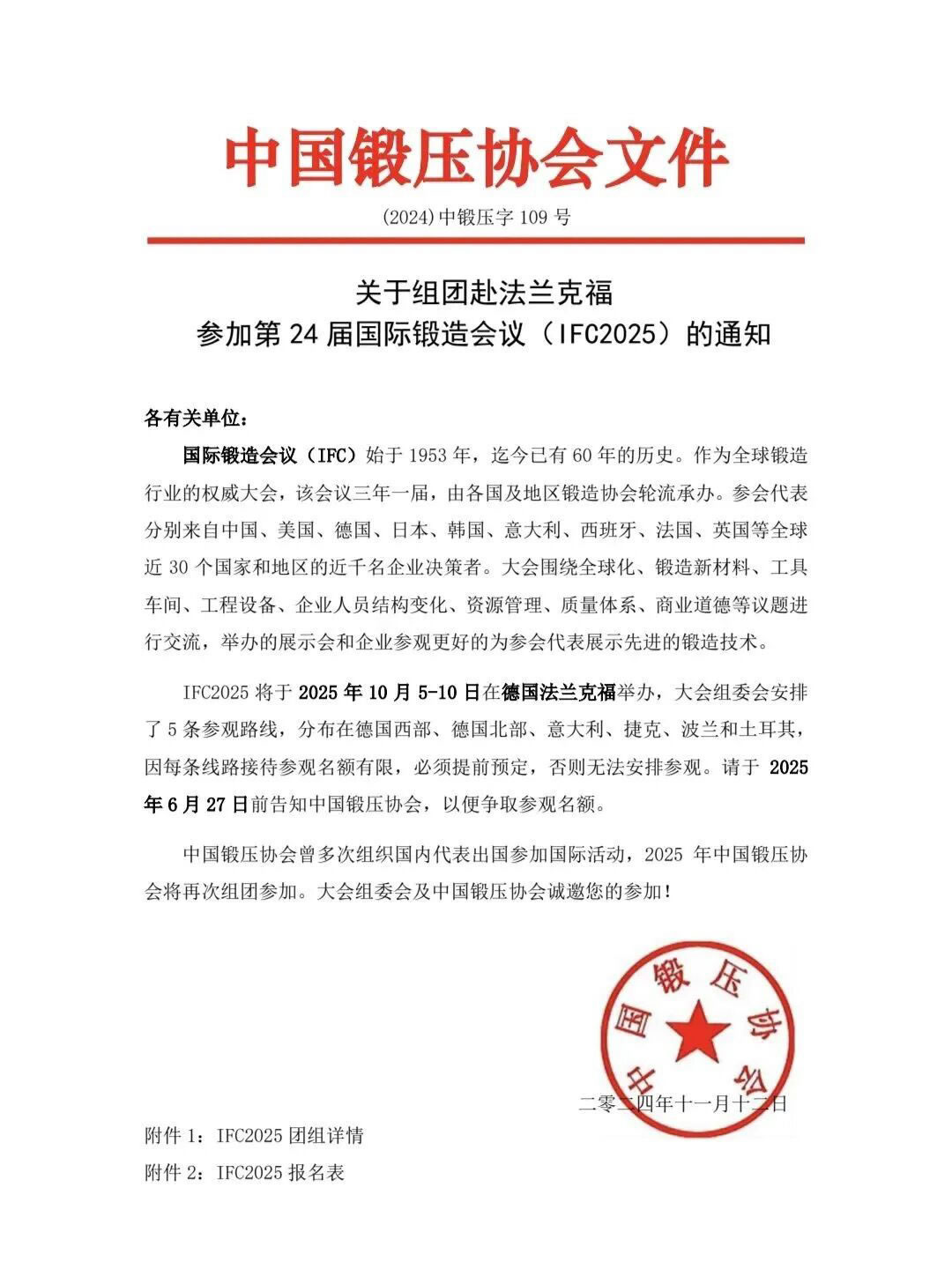 我司憑借在精密鍛造領(lǐng)域的技術(shù)積累和市場表現(xiàn),獲得中國鍛壓協(xié)會的正式邀請,成為本次中國代表團(tuán)的重要成員之一。這既是對我司實力的認(rèn)可,也是展示中國鍛造水平的寶貴機(jī)會。